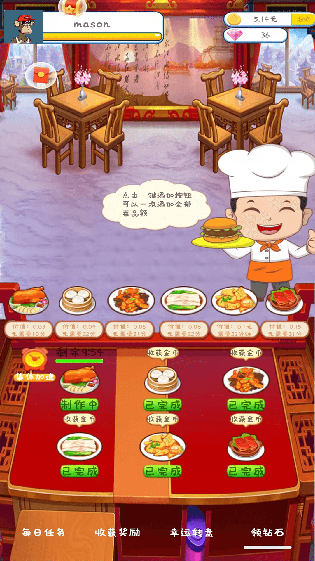 一共有六种菜品制作收获可得金币,金币可用做微信红包提现